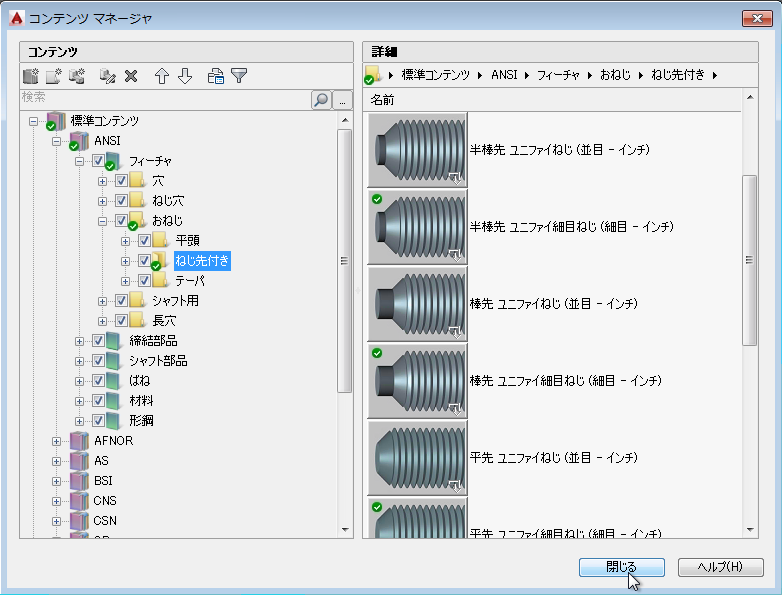 コンテンツ ライブラリを更新することで、コンテンツ ライブラリに既にある標準部品または標準フィーチャの外観が変わる場合があります。これは、一般的にコンテンツの更新で不具合を修正する場合に発生します。不具合のある標準部品または標準フィーチャを図面ファイルに既に挿入している場合は、作図領域で該当する標準部品または標準フィーチャをダブルクリックすると更新することができます。