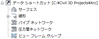 データ ショートカットを作成できるのは、サーフェス、線形、縦断、パイプ ネットワーク、圧力管ネットワーク、およびビュー フレーム グループのみです。データベースを使用せずに、図面間の参照リンクを利用できるようになります。図面からデータ ショートカットを作成すると、プロスペクター ツリーの[データ ショートカット]ノードに表示されます。表示された位置でショートカットを右クリックすると、別の開いている図面に参照オブジェクトを挿入できます。