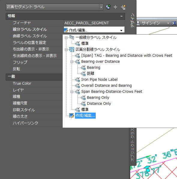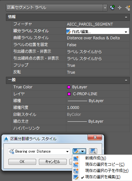 [プロパティ]パレットのスタイル プルダウン メニューから、[作成/編集] (図 13 を参照)を選択して[オブジェクト(区画分割線ラベル)スタイル]ダイアログ ボックスにアクセスします(図 14 を参照)。