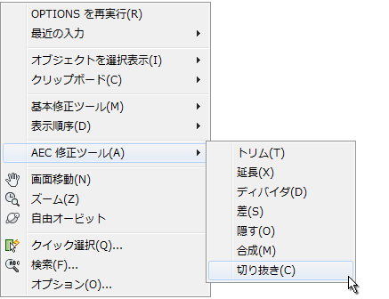 等高線ポリライン データをサーフェスに追加する前に、設計に必要ない地形モデルが組み込まれているかどうかを考慮します。組み込まれている場合、AEC 修正ツールを使用して不要な輪郭部分を削除できます。図 5 に示すように、これらのツールは、図面内のオブジェクトが選択されていないときに右クリック メニューで使用できます。