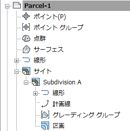 図面にはサイトをいくつでも含めることができますが、各サイトには 1 つの区画コレクションしか含められません。一意の区画は複数のサイトに属することはできません。こうした関係を、[ツールスペース]の[プロスペクター]タブの[サイト]コレクションで確認できます。