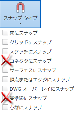 - まず、[オプション]パネルの[スナップ タイプ]ドロップダウン メニューで、[頂点またはエッジにスナップ]および[基準線にスナップ]スナップ オプションを有効にします。このメニューで他のスナップ オプションを無効にします。