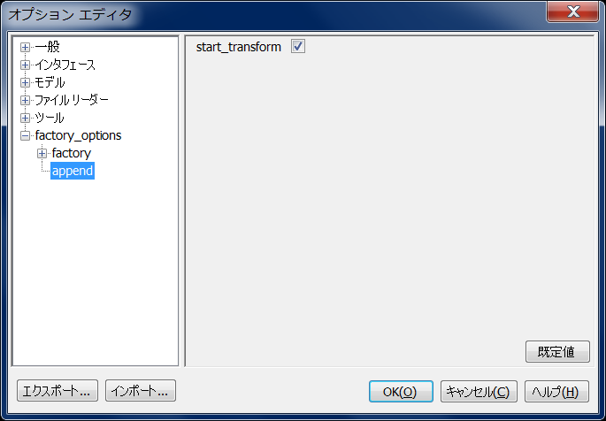 この動作を防止するには、次に示すように、Navisworks の[オプション エディタ]ダイアログで、[ファイルを追加]を選択し、[Start Transform command after appending file]チェック ボックスをオンにします。