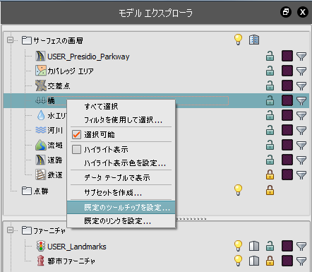 - [モデル エクスプローラ]で、作成しているツールチップを含むフィーチャ クラスの行を右クリックします。