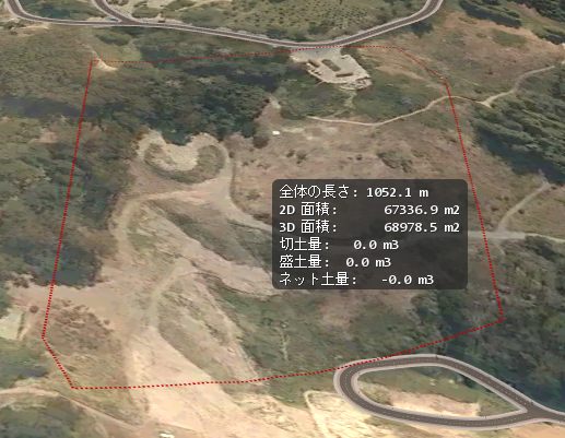 [地形統計情報]ツールは、全体の長さ、2D および 3D 面積、および選択した地形領域の体積を計測します。