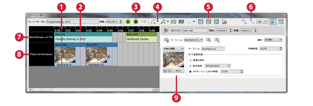 - 再生コントロールは、再生先頭インジケータ(青色の線)から、ストーリーボード全体を再生します。要素ごとにそれ自体の再生コントロールがあります。