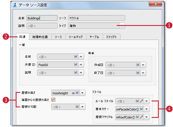 - その他のデータ タイプ固有のスタイル プロパティ(建物のファサードの基本カラー、屋根のマテリアルなど)を指定します。