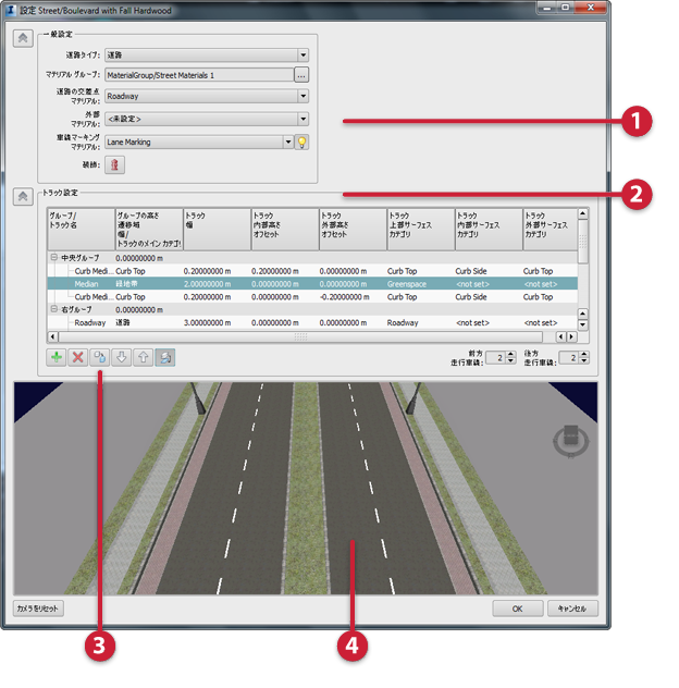 [トラック設定]テーブルの行は道路の要素を表し、列は各トラックの属性を表しています。これらの行は、道路の右側と中央分離帯のグループ別に整理されています。