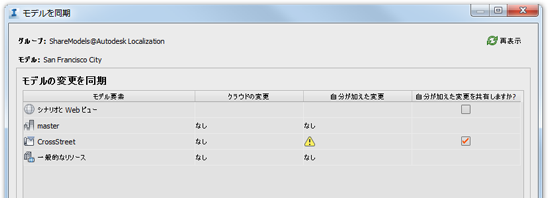- モデル要素のタイプごとに[クラウドの変更]、[自分が加えた変更]、[自分が加えた変更を共有しますか]を確認します。この同期で更新を適用するかどうかに応じて、要素について[自分が加えた変更を共有しますか]を選択または選択解除します。