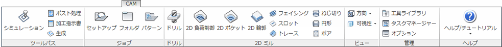 最初の加工操作を作成するには、[CAM]ツールバーからツールパス加工法のいずれかを選択します。必然的に必要となるツールパスの種類は、パーツの図形によって異なります。個々の加工方法の詳細については、Inventor HSM Expressのヘルプ トピック「2D 加工法について」を参照してください。