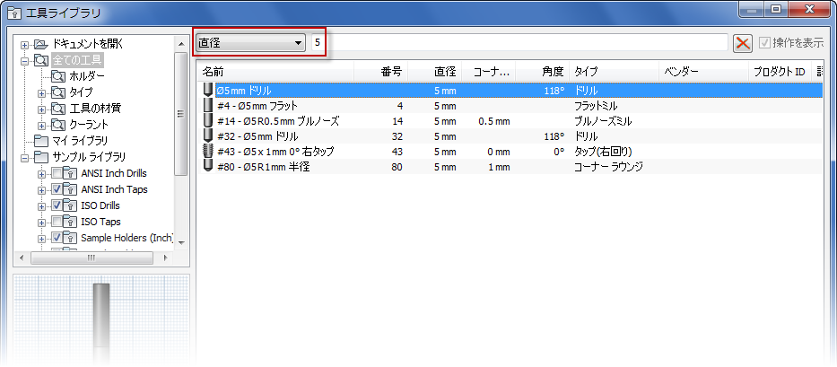 オプションで、検索対象を特定のフィールドに制限して検索することができます。たとえば、直径 5 mm のすべての工具を検索するには、[直径]を選択し、検索フィールドに 5 と入力します。