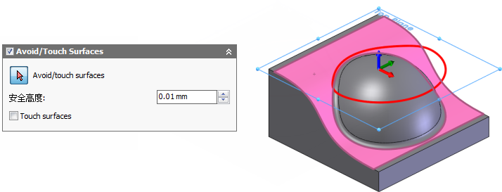 [接触サーフェス]チェック ボックスを有効にすると、回避サーフェスの意味を反転することができます。有効にすると、回避サーフェスは特定のクリアランス内で接触する必要があるものとなり、残りのサーフェスは回避されます。