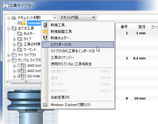 注: 別のフォルダにエクスポートする場合は、そのフォルダを[ライブラリ]ダイアログ ボックスで追加するまで、ライブラリは工具ライブラリには表示されません。また、[ライブラリから工具をインポート]オプションを使用して、ライブラリから工具をインポートすることができます。
