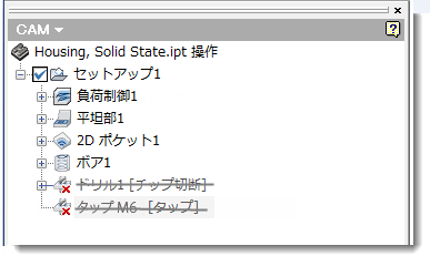 操作が省略されると有効なツールパスが消去され、警告メッセージが表示されます。省略された操作は、淡色表示のグレーのカラーとツールパスが無効であることを示す小さな赤い「x」を使用して CAM ブラウザに表示されます。