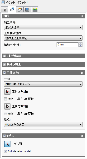 既定では有効になっています。操作で選択したモデルのサーフェスに加えて、セットアップで選択したモデルも含まれます。このチェック ボックスをオフにすると、操作で選択したサーフェス上にのみツールパスが生成されます。