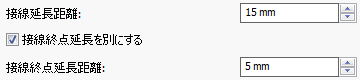 開いた輪郭の始点で 15 mm、終点で 5 mm に設定された接線延長距離
