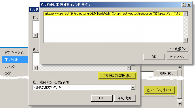 - マニフェストを .dll に組み込むため作成後処理を追加します。作成後処理は、アドインの .dll にマニフェストを埋め込む Microsoft ユーティリティである mt.exe を呼び出します。[アプリケーション プロパティ]ダイアログ ボックスの[コンパイル]タブで、[ビルド イベント...]をクリックします。[ビルド イベント]ダイアログ ボックスで、[ビルド後の編集...]をクリックします。[ビルド後に実行するコマンド ライン]ダイアログ ボックスで、次の行を入力し、OEMTestAddin をアドインの名前と置き換えます。