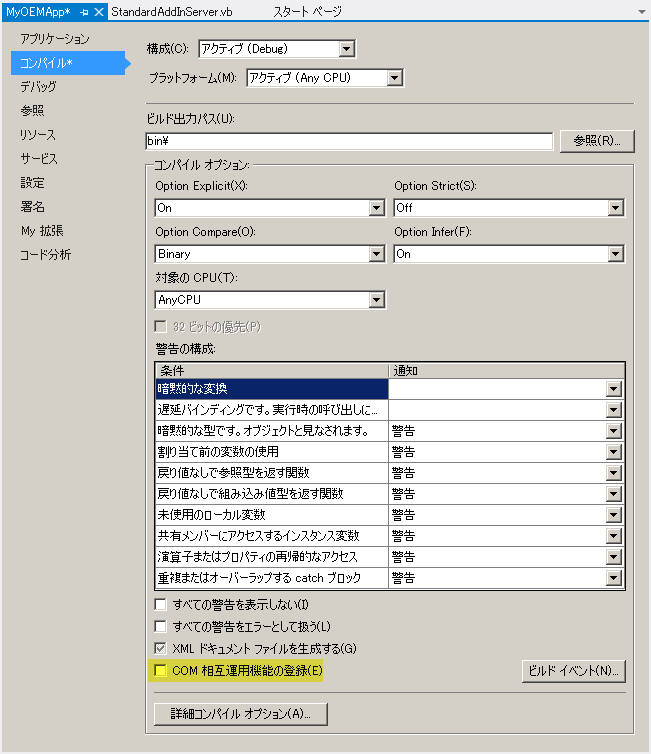 - 次の図に示すように、[アプリケーション プロパティ]ダイアログ ボックスの[コンパイル]タブで、[COM 相互運用機能の登録]チェック ボックスをオフにします。