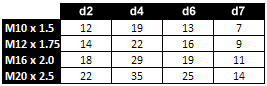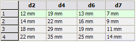 - 別途 2つの行を追加します。最初の行の値を、d2 = 18 mm、d4 = 29 mm、d6 = 19 mm、および d7 = 11 mm に設定します。2 番目の行の値を、d2 = 22 mm、d4 = 35 mm、d6 = 25 mm、d7 = 14 mm に設定します。