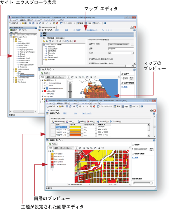 Infrastructure Studio を開いてサイト サーバに(WebAgent 経由で)接続すると、リソース リポジトリに保存されているリソースが、上側にある図のようにサイト エクスプローラに表示されます。サイト エクスプローラでリソースをダブルクリックすると、そのリソースに対応したエディタが開きます。リソースが画層またはマップの場合は、ビューアも開き、データのプレビューを表示します。