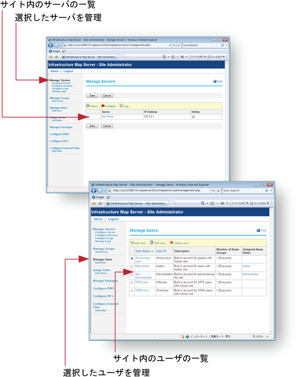 図は、Site Administrator プログラムの 2 つのビューを示しています。上側の図はホーム ページを示しています。このページにはサイト内のサーバのリストが表示されます。 下側の図はユーザと各ユーザが所属するグループのリストの例を示しています。