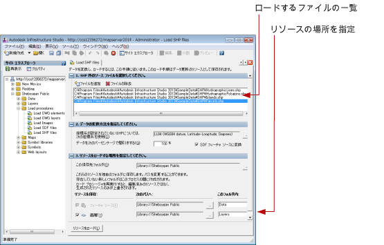 この手順では、必要な .shx および .dbf ファイルが、.shp ファイルと同じフォルダ内に存在すると仮定しています。 シェイプファイルをロードするには、ソース ファイルを[サイト エクスプローラ]にドラッグします。 Autodesk Infrastructure Studio では、新しいフィーチャ ソースだけでなく画層も自動的に作成されます。
