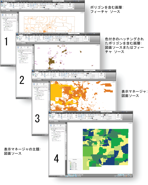 Map の DWG ファイルの 4 つのビューを示しています。スタイルが設定されていないポリゴンがある画層(一番上のスクリーンショット 1)は、単純なジオメトリしか含まないので、フィーチャ ソースに変換されます。 表示マネージャのスタイルと主題(3 および 4)には既にスタイルが設定されているため、これらは図面ソースに変換されます。 また、スタイルが設定されているポリゴン画層もあります(2)。 この場合、画層をフィーチャ ソースに変換するとスタイルは失われますが、図面ソースに変換するとスタイルは保持されます。