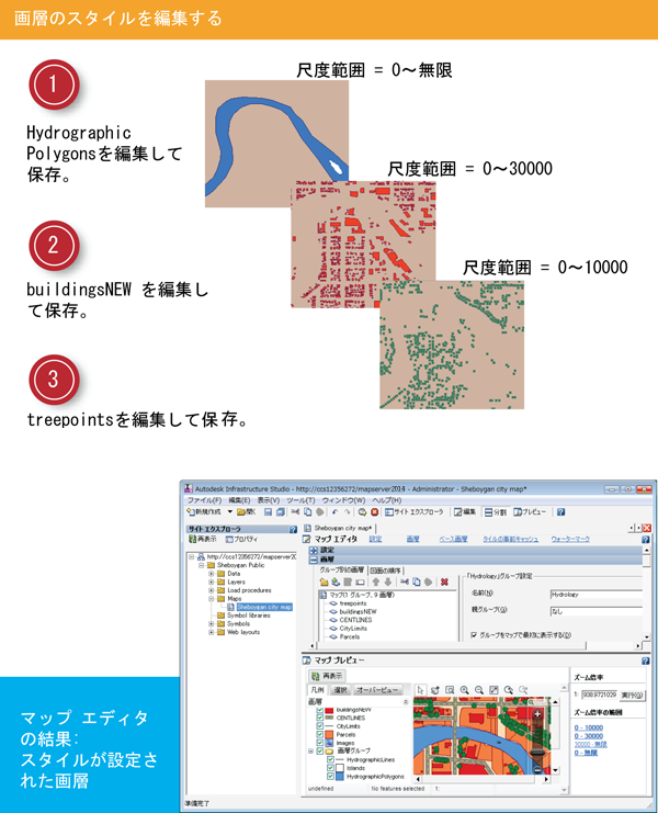 この実習では、マップの画層が適切な尺度でカラー表示されるようにするために、未編集の画層の一部にスタイルを設定します。