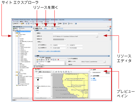 Autodesk Infrastructure Studio のアプリケーション ウィンドウで、[サイト エクスプローラ]を使用してリソース リポジトリとエディタ ペインにアクセスし、リソースの定義と編集を行います。