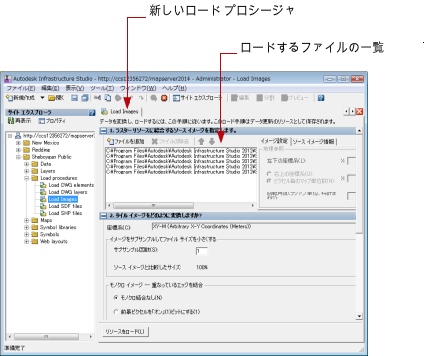 [サイト エクスプローラ]の右側に新しいロード プロシージャが表示されます。 Autodesk Infrastructure Studio は、最初のイメージ ファイルのロード後に、イメージのカタログ ファイルを用意し、そのカタログに名前を付けます。