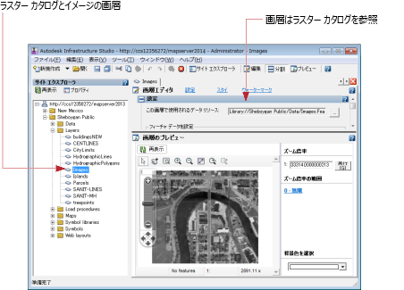 Autodesk Infrastructure Studio は、イメージを 1 つのラスター カタログ リソースに変換し、それを参照する画層を作成します。 ラスター カタログと画層のアイコンが[サイト エクスプローラ]内に表示されます。