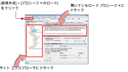 ロード プロシージャは、リソースとしてサイト エクスプローラ内に表示されます。 これらのリソースは、再利用、コピー、または修正できます。 ロード プロシージャは、データを再ロードするために保存されたスクリプトです。 ロード プロシージャを使用すると、サーバ上のリソースの更新を自動化できます。 プロシージャにより、ソース ファイルの場所、変換規則、結果のデータを配置するサーバ上の場所がキャプチャされます。 これらの変換規則を実行することにより(Autodesk Infrastructure Studio で対話的に実行するか、スクリプトを使って実行)、サイトにあるファイル ベースの空間データを更新できます。 スクリプトは、夜間定期的に実行し、データを最新の状態に保持することができます。