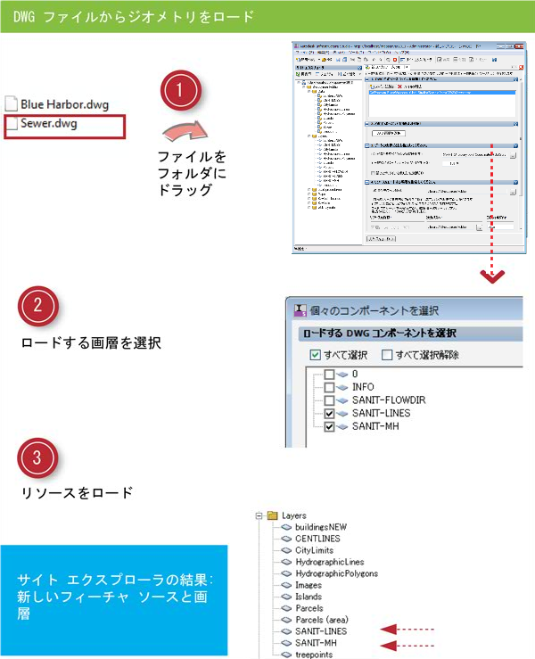 この実習では、DWG ファイルをロードして、ファイル内の画層のサブセットを選択します。 DWG の各画層に対して、フィーチャ ソースと画層リソースが作成されます。