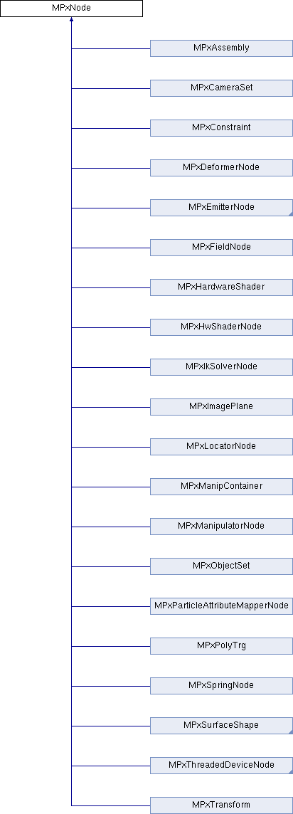 Reimplemented in MPxAssembly, MPxDeformerNode, MPxManipContainer, MPxHwShaderNode, MPxTransform, MPxHardwareShader, MPxThreadedDeviceNode, MPxIkSolverNode, MPxSurfaceShape, MPxClientDeviceNode, MPxLocatorNode, MPxEmitterNode, MPxSpringNode, MPxFieldNode, MPxImagePlane, MPxFluidEmitterNode, MPxObjectSet, MPxCameraSet, and MPxParticleAttributeMapperNode.