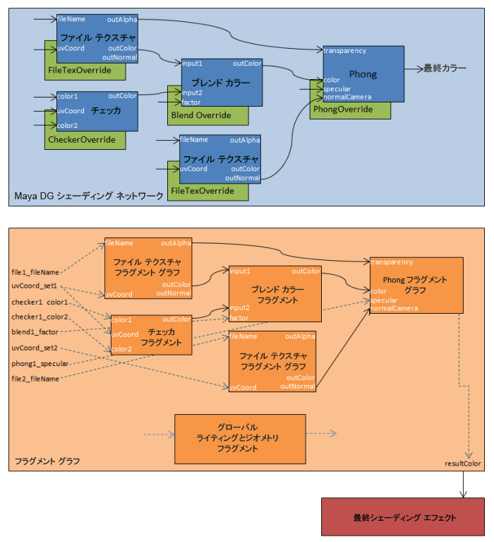 図 43: 重要な Maya シェーディング ネットワークと、最終シェーディング エフェクトの作成に使用されるハードウェア フラグメント グラフにそれが変換される過程を示しています。各シェーディング ノードには、関連するシェーディング ノード オーバーライドがあります。オーバーライドは、ノードに対して作成されるハードウェア フラグメントまたはフラグメント グラフを指定します。これらのフラグメントは、いくつかのグローバル ライティング フラグメントおよびジオメトリ フラグメントとともに結合され、最終的なフラグメント グラフが作成されます。グラフの入力パラメータは、含まれているフラグメントの入力パラメータを制御します。