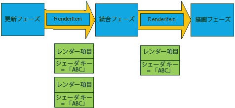 図 42: シェーダ オーバーライドによって提供されるシェーダ キーを 2 つのレンダー アイテムで同じにすることができます。この場合、統合によって、描画が行われる前にこれらの項目を 1 つのレンダー項目に「マージ」できます。