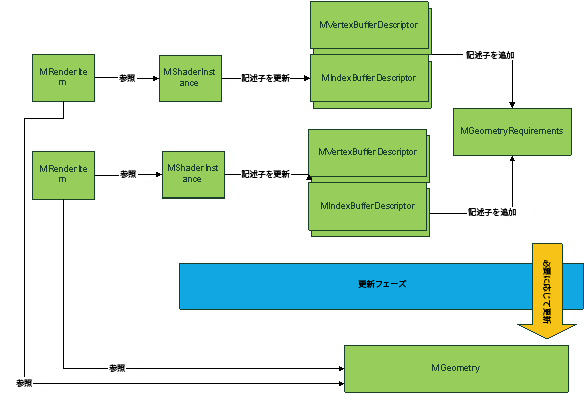 「シェーダ」の代わりに、MShaderInstance インスタンスは、MRenderItem によって参照されます。MShaderInstance で表現されるシェーダのジオメトリ アトリビュートは、頂点記述とインデックス記述のセットを提供し、これにより更新時に使用される要件が指定されます。
