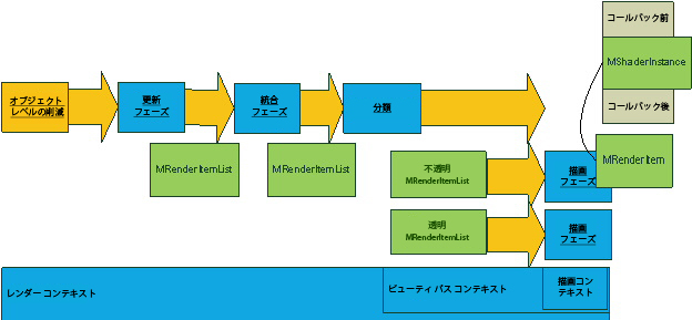 上記の図では、前の図にあった抽象的な構成要素の一部は、API で公開される構成要素に置き換えられています。更新フェーズでは MRenderItems (および、それらに関連付けられた MShaderInstances)を生成します。レンダー項目が「透明度」レンダー項目リストに転送されるようにするために、MShaderInstance 上の透明度インジケータは、統合フェーズおよび分類フェーズ中に考慮されます。描画フェーズ中に、MRenderItem が検査されます。 対応する MShaderInstance はシェーダを設定し、MShaderInstance のパラメータ値に基づいて実際のハードウェア シェーダを更新します。MGeometry 内で参照されるジオメトリはバインド、描画されます。 MShaderInstance に関連付けられたすべてのプリ/ポスト コールバックは、適切な時間に呼び出されます。