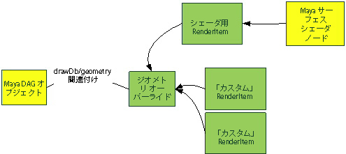 図 38: MPxGeometryOverride が分類文字列により特定の DAG オブジェクトに関連付けられています。内部サーフェス シェーダからのレンダー項目およびカスタム レンダー項目が、オーバーライドで処理するレンダー項目のセットの一部となっている構成の例を示してあります。