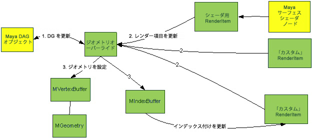 図 39: 3 つのフェーズは、MPxGeometryOverride の更新に関係するメイン コンストラクト間の接続ラベルに使用されます。最初のフェーズ(1.)は、関連付けられた DAG オブジェクトへのアクセスに関連します。2 番目のフェーズ(2.)では、レンダー項目を更新し、ジオメトリの要件を決定します。3 番目のフェーズ(3.)では、頂点とインデックス バッファのデータおよび各レンダー項目に対するインデックスの関連付けを更新します。この例では、関連付けられているサーフェス シェーダ用の 1 つと、オーバーライドで描画するカスタム レンダー項目用の 2 つで構成される 3 つのレンダー項目から更新要件が決まります。