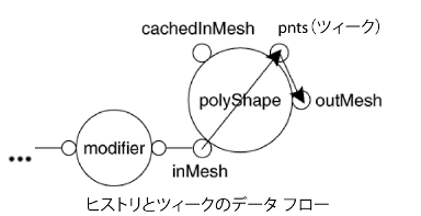 コンストラクション ヒストリが存在する場合は(入力接続が存在する場合は)、polyShape ノードに上流ノードが存在します。DG 評価中は、polyShape ノードに渡されたデータにより polyShape ノードの inMesh が上書きされ、outMesh が更新されます。このため、ヒストリが存在する場合は、polyShape ノード上でのアトリビュートの設定、またはノードのダイレクト モディファイアは次の DG 評価で上書きされますので避けてください。メッシュを修正するには、修正内容を含むモディファイア ノードを polyShape ノードの上に挿入する必要があります。この修正内容は、ヒストリが存在する限り、微調整の存在に関係なく適用されます。詳細については、コンストラクション ヒストリを参照してください。DG では、モディファイア ノードを上に挿入して変更内容の上書きを避ける必要があるので、このケースでは、ノード自体と直接やり取りすることが少なくする必要があります。