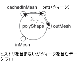 ノードにコンストラクション ヒストリが存在せず、微調整が存在するということは、ノードに入力接続が存在せず、pnts アトリビュートにゼロ以外の値が存在することになります。この場合は、微調整を適用する必要があるので、outMesh を使用できません。微調整を outMesh に直接適用した場合は、元に戻す(undo)機能がないと前の値が失われることになります。このため、シミュレート入力、つまり cashedInMesh が必要になります。これにより、outMesh の現在の状態が格納されてから微調整が適用され、ノードが再評価されます。outMesh ジオメトリが cachedInMesh にコピーされ、微調整がノードに適用されます。cachedInMesh は、コンストラクション ヒストリと微調整がある inMesh と同じ働きをします。pnts アトリビュートは、cachedInMesh に適用されてから outMesh に転送されます。