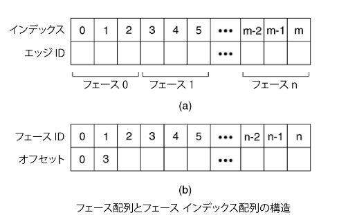 フェース オフセットまたはインデックス配列により、フェース配列は補完されます。この配列には、フェース配列での各フェースの記述の開始場所が保存されます。各フェースは、多くのエッジと複数のシーケンスから構成されるので、各フェースの先頭を探しながら配列を調べると冗長になることがあります。このフェースインデックス配列を使用すると、各フェースに関する情報にすばやくアクセスできます。各フェース位置のインデックスは、指定されたフェースのフェース ID と呼ばれます。各フェースの先頭をマークする要素に加えて、フェース インデックス配列の末尾には、フェース リストの最終インデックスをマークする要素が付きます。この最終インデックスの値により、各フェースの順序(フェースのエッジと頂点の数)にすばやくアクセスできるようになります。
