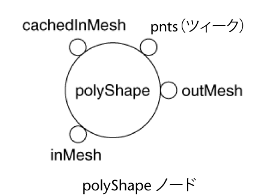 コンポーネントは、単独でメッシュのジオメトリを表現できます。しかし、柔軟性に富んだ Maya アーキテクチャに合わせるために、この構造は polyShape ノードという形式でディペンデンシー グラフ アーキテクチャに統合されます。polyShape ノードには、以下の図のように、inMesh、outMesh、cachedInMesh、pnts (微調整)という、4 つの基本アトリビュートがあります。