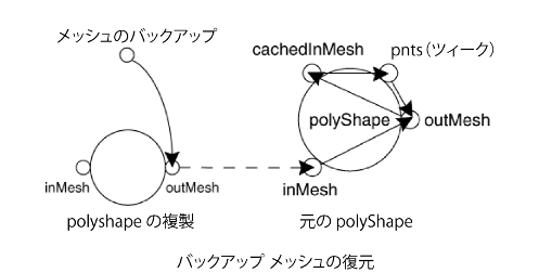 これにより、inMesh を通して outMesh が更新されるので、ノードが切断されて inMesh が無効になると、cachedInMesh が微調整を適用する前の元のメッシュ バックアップを維持します。これは polyModifierCmd の例で示しています。以下で、メッシュのバックアップを復元する場合のデータ フローを説明します。
