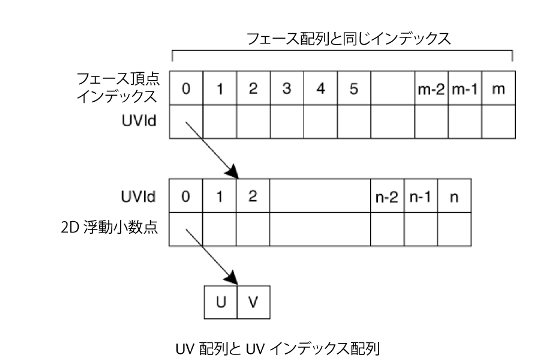 UV は、フェース頂点の概念に大きく依存しています。UV は 2D プレーンに対応し、ポリゴン サーフェスへのテクスチャ マッピングに使用します。テクスチャ マッピングはフェースごとに実行されます。その結果、UV はフェース頂点をベースにマッピングされ、必要に応じて、それぞれのフェースでマッピング座標の独自のセットを持つことができます。Maya で UV を含む構造は、以下の 2 つの配列から構成されます。