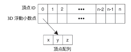 ポリゴンメッシュの頂点は 3 次元の float 型の単純配列に格納され、それぞれの頂点には、配列の指定されたインデックスに基づいて頂点 ID が付きます。エッジとフェースは両方とも、この配列に基づいています。