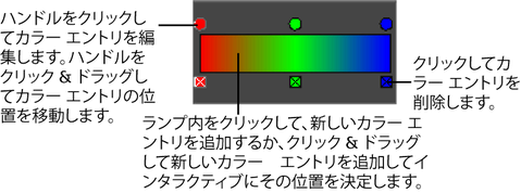 カラー エントリごとにランプの上には円形のカラー ハンドルが、下には正方形のカラー アイコンが表示されます。アクティブなカラーは、そのカラー ハンドルとカラー アイコンの回りに白い境界が表示されます。ランプは、透明度、カラーなどを含む、さまざまなタイプのグラディエントに使用することができます。