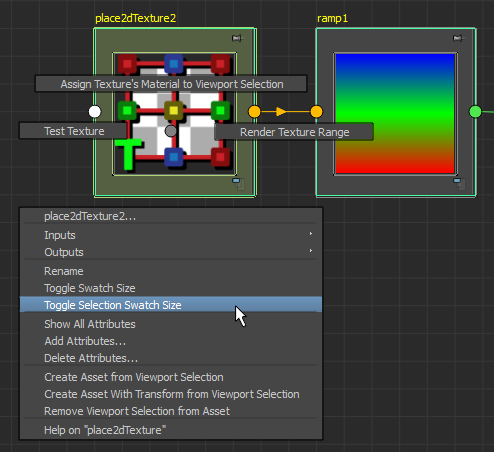 どのビュー モードでも、 でノードをクリックしてノード マーキング メニューからスウォッチのサイズを切り替え(Toggle Swatch Size)または選択スウォッチ サイズの切り替え(Toggle Selection Swatch Size)を選択することで、ノード スウォッチの大小のバージョンを切り替えることができます。