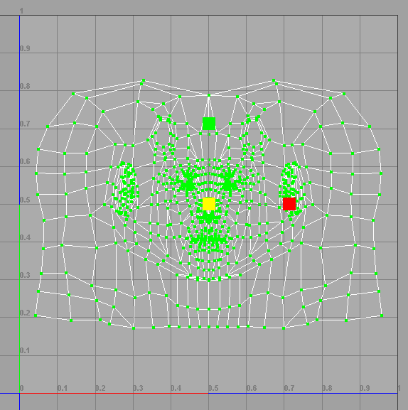 - 額の上部中心にある UV を選択し、UV テクスチャ エディタ(UV Texture Editor)でポリゴン > 展開(Polygons > Unfold) >